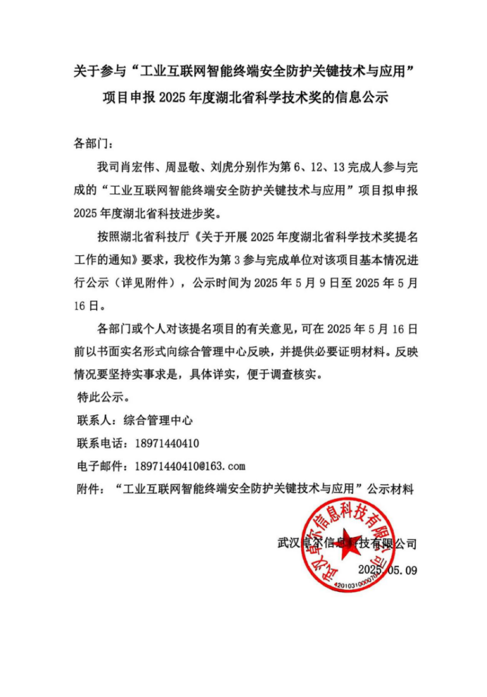 我司肖宏伟、周显敬、刘虎分别作为第6、12、13完成人参与完成的“工业互联网智能终端安全防护关键技术与应用”项目拟申报2025年度湖北省科技进步奖。